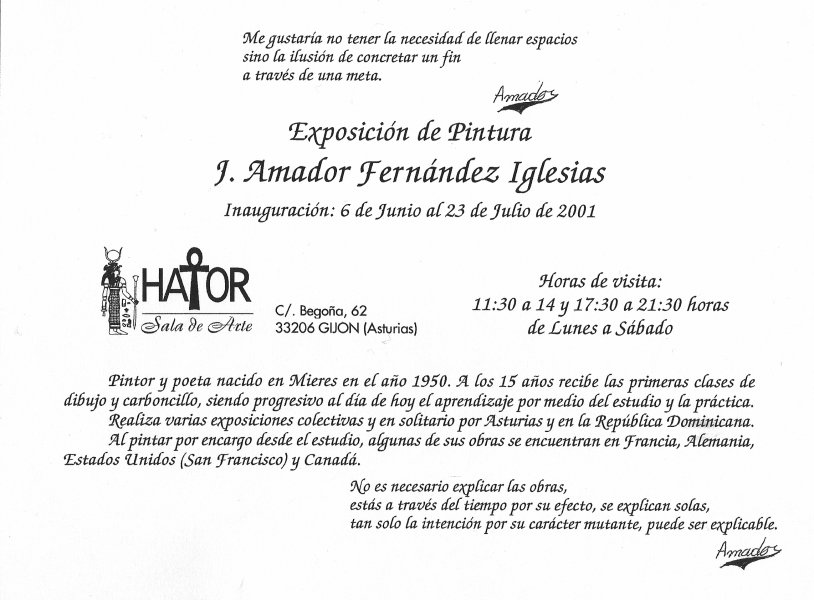 Exposición entre el 6 de junio y el 23 de julio del año 2.001 en la Sala de Arte Hator (Gijón)